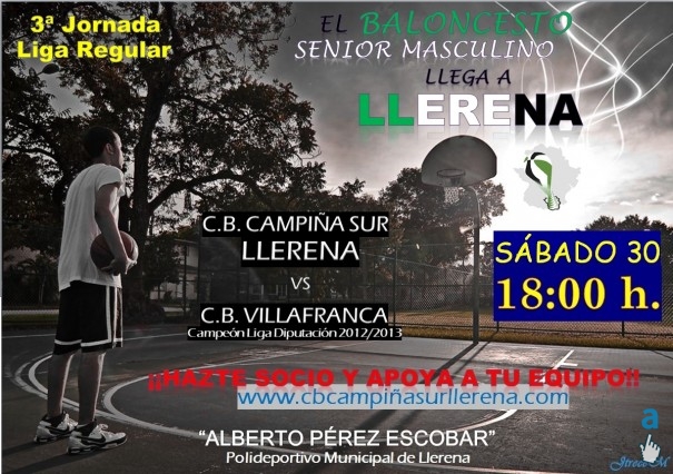 El próximo sábado 30 de noviembre de 2013, a las 18:00 hs. en el Pabellón Municipal de Llerena "Alberto Pérez", el equipo sénior masculino debuta en liga frente al actual campeón del Trofeo Diputación de Badajoz, el C.B. Villafranca. Después de que jugásemos y ganásemos en la primera jornada, y descansar en la segunda, la tercera nos depara un duro rival. Servirá para ver en qué punto se encuentra el equipo. Ilusión y ganas de jugar no faltan. Esperamos el apoyo y ánimo del público. ENTRADA GRATUITA. ¡VUESTRO APOYO ES FUNDAMENTAL! ¡CRECIENDO JUNTOS!