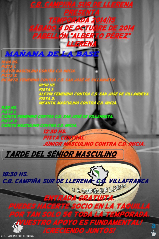 El próximo sábado 4 de Octubre, desde las 10:00 hs. en el Pabellón Municipal de Llerena "Alberto Pérez", el C.B. Campiña Sur de Llerena presenta a todos los equipos de la BASE.