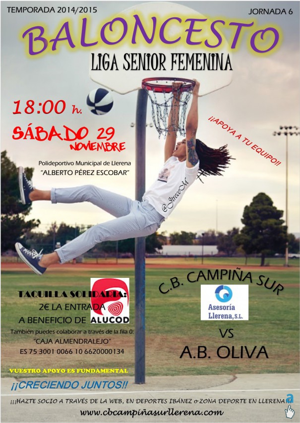 Sábado 29 de noviembre en el Pabellón Municipal "Alberto Pérez". Se pondrá en marcha la TAQUILLA SOLIDARIA, entrada 2 €. El dinero que se recaude con la venta de las entradas, irá a beneficio de ALUCOD. También se podrá colaborar con esta asociación a través de la FILA 0, haciendo donación en la cuenta: