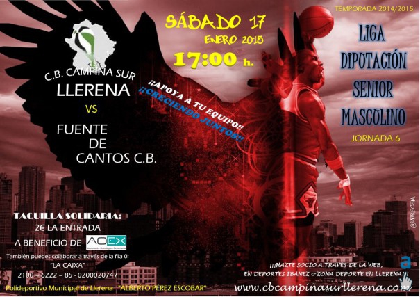 TARDE DEL SÉNIOR MASCULINO: a las 17:00 hs. en el "ALBERTO PÉREZ", frente a Fuente de Cantos C.B. En dicho partido se llevará a cabo la TAQUILLA SOLIDARIA, entrada 2 €. El dinero que se recaude con la venta de las entradas, irá a beneficio de AOEX (DELEGACIÓN DE LLERENA). También se podrá colaborar con esta asociación a través de la FILA 0, haciendo donación en la cuenta:
