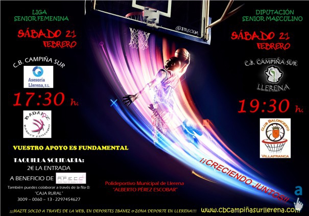 ASESORÍA LLERENA C.B. CAMPIÑA SUR - BADAJOZ BÁSKET FEMENINO. En este partido se llevará a cabo la TAQUILLA SOLIDARIA, entrada 2 €. El dinero que se recaude con la venta de las entradas, irá a beneficio de A.F.E.C.C.. También se podrá colaborar con esta asociación a través de la FILA 0, haciendo donación en la cuenta: