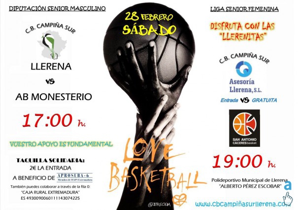 En este partido se llevará a cabo la TAQUILLA SOLIDARIA, entrada 2 €. El dinero que se recaude con la venta de las entradas, irá a beneficio de APROSUBA 6. También se podrá colaborar con esta asociación a través de la FILA 0: CAJA RURAL DE EXTREMADURA ES4930090060111143074225, haciendo donación en la cuenta. Esta iniciativa del C.B. Campiña Sur de Llerena, la TAQUILLA SOLIDARIA, pretende ayudar a asociaciones llerenenses que desarrollan una acción social. Se llevará a cabo en los partidos de los equipos seniors. Esperamos una buena respuesta de todos los llerenenses y su comarca.