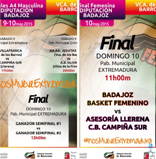 El próximo fin de semana tendrán lugar las finales del TROFEO DIPUTACIÓN DE BADAJOZ, femenina y masculina, en el Pabellón Extremadura de Villafranca de los Barros. La organiza el C.B. Villafranca, el Excmo. Ayto. de Villafranca de los Barros y la Federación Extremeña de Baloncesto.