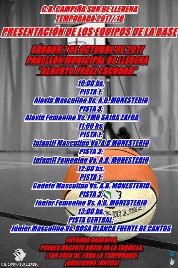La mañana del sábado 7 de octubre de 2017, tendrá lugar la puesta de largo de todos los equipos de la cantera del C.B. CAMPIÑA SUR DE LLERENA. Será en el Pabellón Municipal "ALBERTO PÉREZ", de Llerena. Este año tendremos a A.B. MONESTERIO, FUENTE DE CANTOS C.B. y F.M.D. SAJRA ZAFRA. Agradecerles su participación. El horario de partidos y pista, es el siguiente: