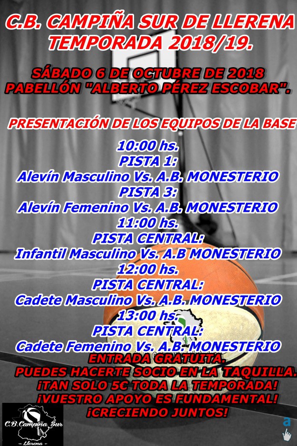 La mañana del sábado 6 de octubre de 2018, tendrá lugar la puesta de largo de equipos de la cantera del C.B. CAMPIÑA SUR DE LLERENA. Será en el Pabellón Municipal "ALBERTO PÉREZ", de Llerena. Nos visitan nuestros amigos de A.B. MONESTERIO. El horario de partidos y pista, es el siguiente: