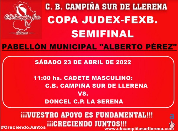 La mañana del sábado 23 de abril de 2022, BALONCESTO en el "ALBERTO PÉREZ". Nuestro equipo CADETE MASCULINO, juega las semifinales de la COPA JUDEX-FEXB, frente al DONCEL C.P. LA SERENA. Fuerte el rival que nos visita, pero lo daremos todo en una eliminatoria que se juega a partido único, y que por sorteo jugamos en casa.¡Animamos a familiares y aficionados a ir al pabellón a animar y apoyar deportivamente, como siempre!