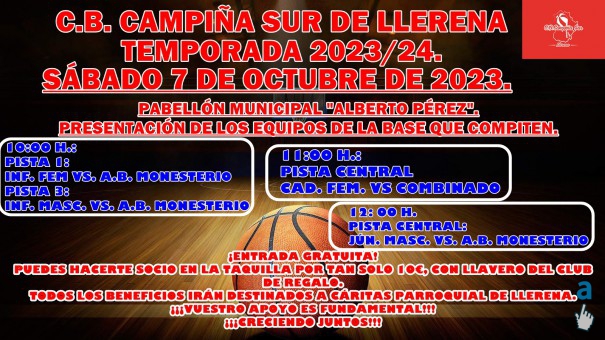La mañana del sábado 7 de octubre de 2023, tendrá lugar la puesta de largo de los equipos de la cantera del C.B. CAMPIÑA SUR DE LLERENA, que competirán esta próxima temporada en JUDEX.