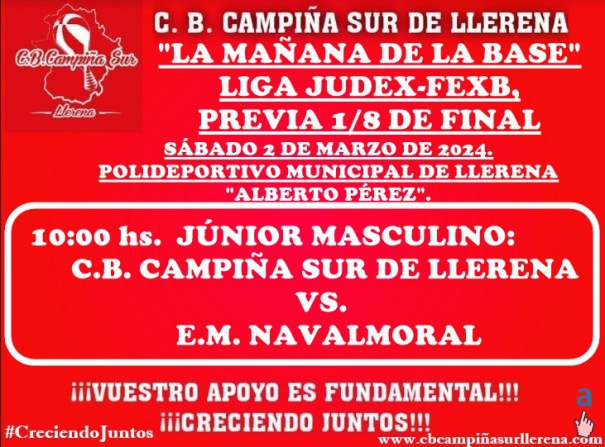 El próximo fin de semana se juega un solo partido  liga JUDEX-FEXB de nuestros equipos de la BASE que compiten. El equipo  JÚNIOR MASCULINO, jugará el sábado "LA MAÑANA DE LA BASE"  la PREVIA 1/8 DE FINAL, a partido único, en el Polideportivo Municipal de Llerena "ALBERTO PÉREZ". ¡OS ESPERAMOS!