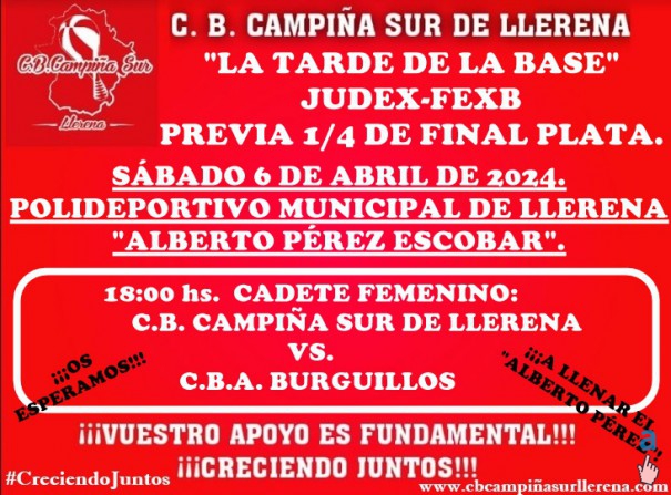 El próximo fin de semana juegan partidos JUDEX-FEXB nuestros equipos de la BASE que compiten. Los equipos INFANTIL FEMENINO (COPA IMEX BALONCESTO FEMENINO) e INFANTIL MASCULINO (COPA DIPUTACIONES MASCULINA) la tarde del viernes 5  de abril de 2024 en la pista del P.M.D. AZUAGA. El equipo JÚNIOR MASCULINO juega el sábado por la mañana en la pista de MARISTAS C.B.A. BLACK, a un solo partido, la PREVIA 1/4 DE FINAL PLATA. El equipo CADETE FEMENINO, jugará el sábado "LA TARDE DE LA BASE" en el Polideportivo Municipal de Llerena "ALBERTO PÉREZ ESCOBAR". ¡¡¡OS ESPERAMOS!!!