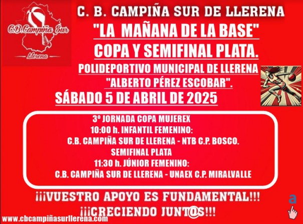 Los equipos INFANTIL y JÚNIOR FEMENINO, jugarán el sábado 5 de abril de 2025 "LA MAÑANA DE LA BASE" en el Polideportivo Municipal de Llerena "ALBERTO PÉREZ". ¡¡¡A LLENAR EL PABELLÓN!!! Debe ser de nuevo la fiesta del baloncesto, animando al máximo, SIEMPRE DESDE EL RESPETO Y LA DEPORTIVIDAD.