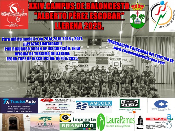 Desde el martes día 6 de Mayo, queda abierto al público el plazo de inscripción del XXIV CAMPUS DE BALONCESTO "ALBERTO PÉREZ ESCOBAR", LLERENA 2025. Hasta el viernes 6 de junio de 2025 o hasta agotar las plazas, se podrán entregar las inscripciones. NO SE ADMITIRÁN INSCRIPCIONES FUERA DE PLAZO. Dicho campus está destinado a niños y niñas nacidos en los años 2014, 2015, 2016 y 2017. La cuota de inscripción es de 30 €, para segundo hermano y sucesivos, 15€ (que incluye SEGURO, CAMISETA, MEDALLA Y BALÓN DE REGALO), cuyo ingreso hay que hacer en el número de cuenta del Banco Santander: ES17-0075-0741-24-0600085266 y reflejando en el resguardo el NOMBRE Y APELLIDOS DEL NIÑO O NIÑA PARTICIPANTE y el concepto "XXIV CAMPUS DE BALONCESTO" .