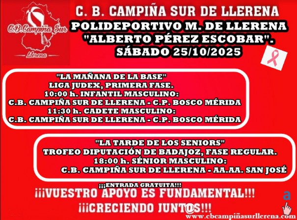 El próximo fin de semana, segunda jornada de la temporada para nuestros equipos de la BASE, en JUDEX-FEXB, y de nuestro equipo SÉNIOR MASCULINO que compite en el TROFEO DIPUTACIÓN DE BADAJOZ. Nuestro equipo INFANTIL FEMENINO, jugará la mañana del sábado en la pista de A.B. OLIVA. Nuestro equipo JÚNIOR FEMENIO, jugará la tarde del viernes en la pista del C.D. MARISTAS. Nuestros equipos MASCULINOS INFANTIL Y CADETE, juegan "LA MAÑANA DE LA BASE" el SÁBADO 18 DE OCTUBRE DE 2025 en el "ALBERTO PÉREZ". El mismo SÁBADO, nuestro equipo SÉNIOR MASCULINO juega "LA TARDE DE LOS SENIORS"