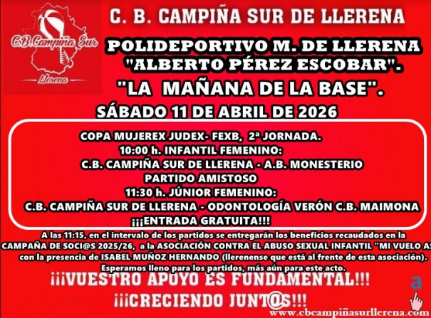 El sábado 11 de abril de 2026, "LA MAÑANA DE LA BASE" en el "ALBERTO PÉREZ", con la segunda jornada de la COPA MUJEREX JUDEX-FEXB para nuestro equipo de la BASE INFANTIL FEMENINO, y partido amistoso de nuestro equipo JÚNIOR FEMENINO, que servirá de cierre de una muy buena temporada. A las 11:15, en el intervalo de los partidos se entregarán los beneficios recaudados en la CAMPAÑA DE SOCI@S 2025/26, a la ASOCIACIÓN CONTRA EL ABUSO SEXUAL INFANTIL "MI VUELO ASI", con la presencia de ISABEL MUÑOZ HERNANDO (llerenense que está al frente de esta asociación). Esperamos lleno para los partidos, más aún para este acto. ¡¡¡A LLENAR EL "ALBERTO PÉREZ!!! Debe ser de nuevo la fiesta del baloncesto, animando al máximo, SIEMPRE DESDE EL RESPETO Y LA DEPORTIVIDAD.