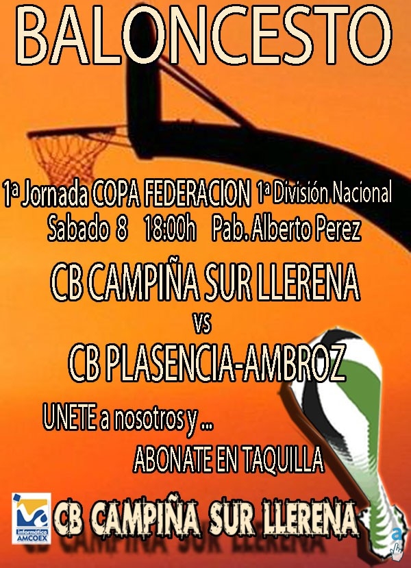 ESTE SABADO 8 A LAS 18 HORAS EN ALBERTO PEREZ NUESTROS CHICOS DEL PRIMER EQUIPO COMIENZAN LA COMPETICION EN LA PRIMERA JORNADA DE COPA FEDERACION, CONTRA EL DOBLE CAMPEON DE LIGA Y COPA EN EL CURSO PASADO "CB PLASENCIA-AMBROZ". AUNQUE TENEMOS CIERTAS DUDAS DE LA PLANTILLA CON LA QUE CONTARA NUESTRO RIVAL, CON EL NOMBRE Y EL CURRICULUM DE ESTOS CHICOS EN LA COMPETICION EN LOS ULTIMOS AÑOS ESTA TODO DICHO, PARTIDO DIFICIL PARA EMPEZAR QUE NUESTRO EQUIPO AFRONTA CON LA ILUSION DEL PRINCIPIO DE TEMPORADA (PARA MAS DE LA MITAD DEL EQUIPO PRIMER PARTIDO EN CATEGORIA NACIONAL) Y CON LA TRANQUILIDAD Y LAS GANAS QUE NOS DA EL TRABAJO BIEN HECHO QUE VENIMOS DESARROLLANDO DURANTE TODA LA PRETEMPORADA.
